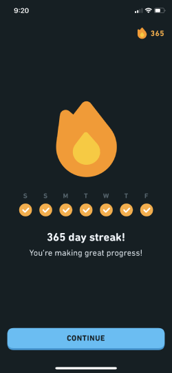 i hit a nice little achievement of 365 day streak with DuoLingo πŸŽ‰